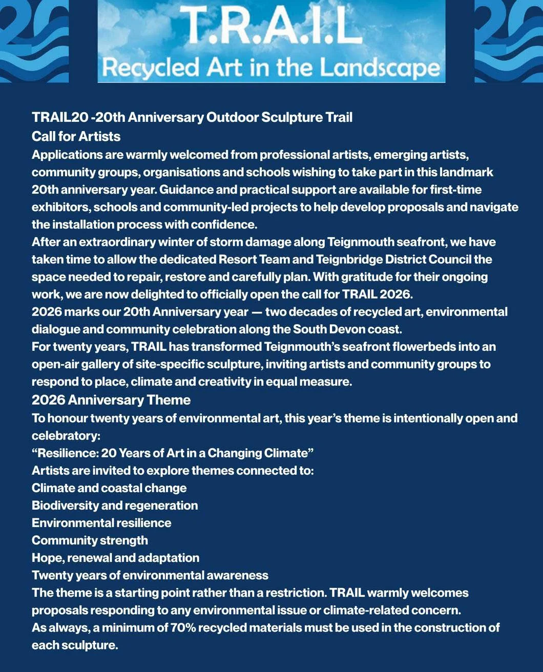 Now, we’re already turning our gaze ahead to Trail 2026, as we prepare to mark 20 years of creativity, sustainable art, and community. Exciting plans are taking shape to make this a truly memorable anniversary year, and we look forward to making it the most spectacular Trail yet.